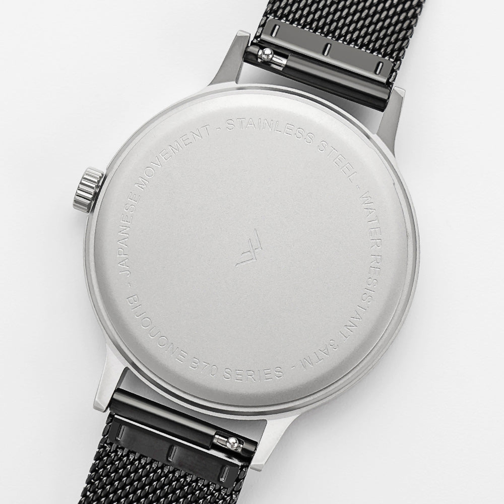 Experience the sleek and stylish B70 Watch in Silver with its 36mm or 40mm diameter and slim 7.2mm or 8mm thickness. The black dial and matte stainless steel finish exude sophistication, while the Japan Quartz movement ensures precise timekeeping. The hardened mineral crystal lens provides durability, and the 18mm black stainless steel mesh strap, complete with quick-release springbar for easy interchangeability, adds a touch of elegance. With water resistance up to 3ATM, this watch is perfect for everyday wear. Available for wrist sizes ranging from 14.5-20cm. Elevate your style with the B70 Watch.